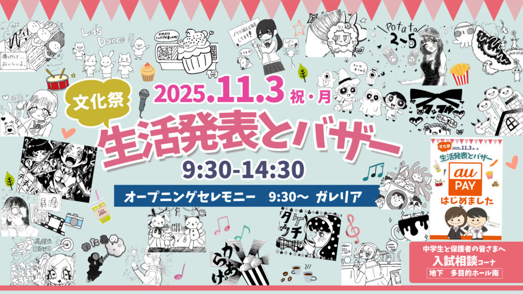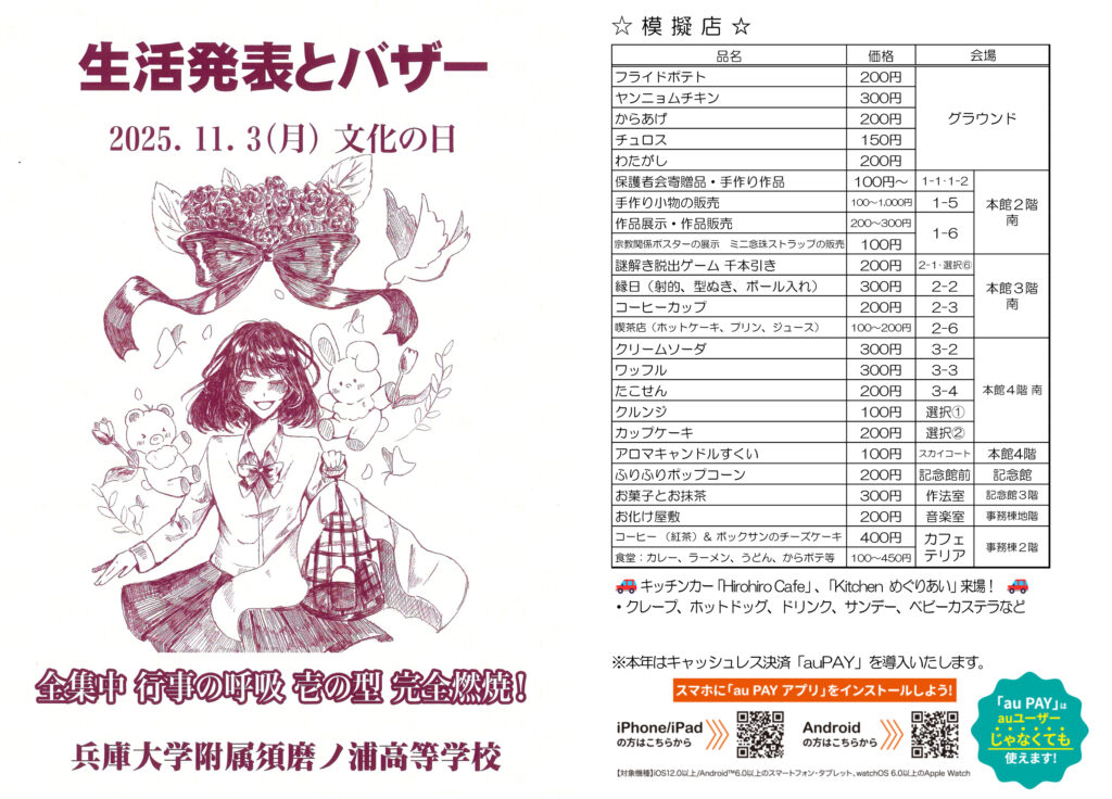 ※本年度の「生活発表&バザー」では、利便性向上および生徒への金融教育を目的として、バザー用品や模擬店等での支払いについて、キャッシュレス決済サービス「au PAY」を導入いたします。事前にアプリ登録と入金(チャージ)をしていただきますと、当日はスムーズに飲食模擬店や各系の催し物などで利用可能となります。現金の使用も可能ですが、ご来場の方におかれましては、可能な限りキャッシュレス決済の利用にご協力いただきますようよろしくお願いいたします。
