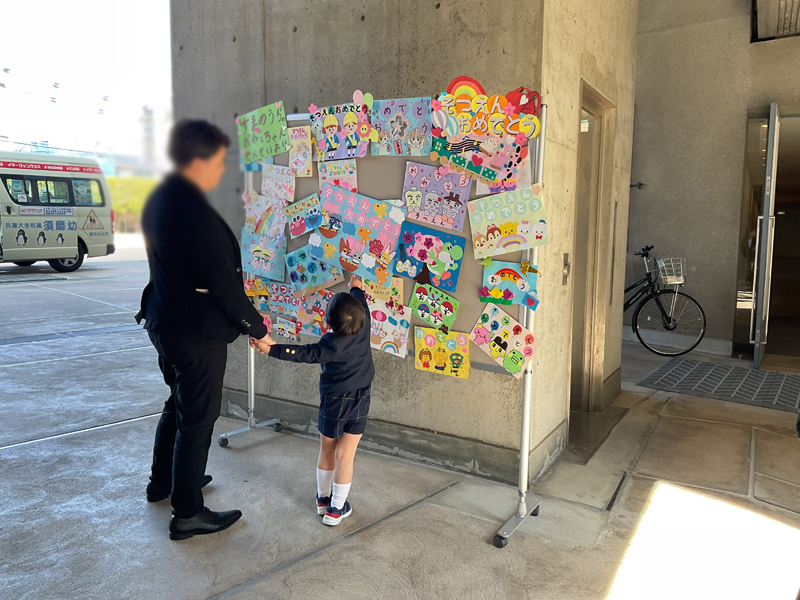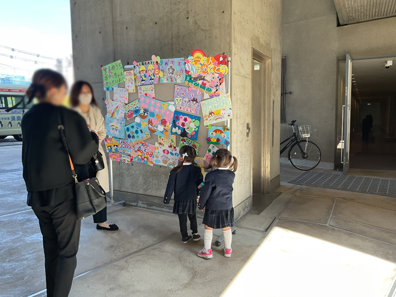 園児たちに喜んでもらえるよう、いろんな色を使ってカラフルに仕上げた作品を卒園生や保護者の方々に立ち止まってみていただくことができました。 須磨幼稚園、年長組のみなさんご卒園おめでとうございます。