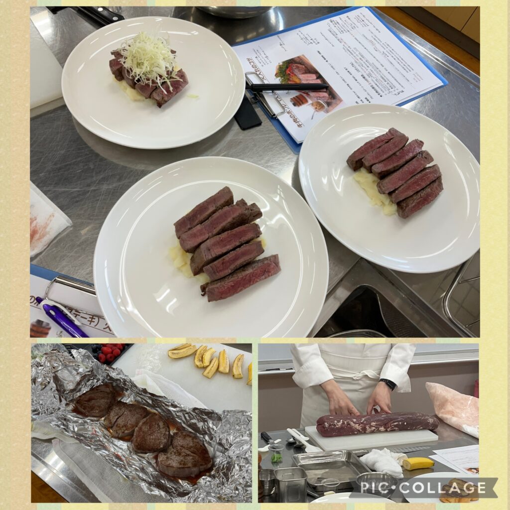 ステーキの実習では、焼き加減や柔らかさを確かめる方法として“自分の手の感触”を使うプロの技を教えていただきました👋✨