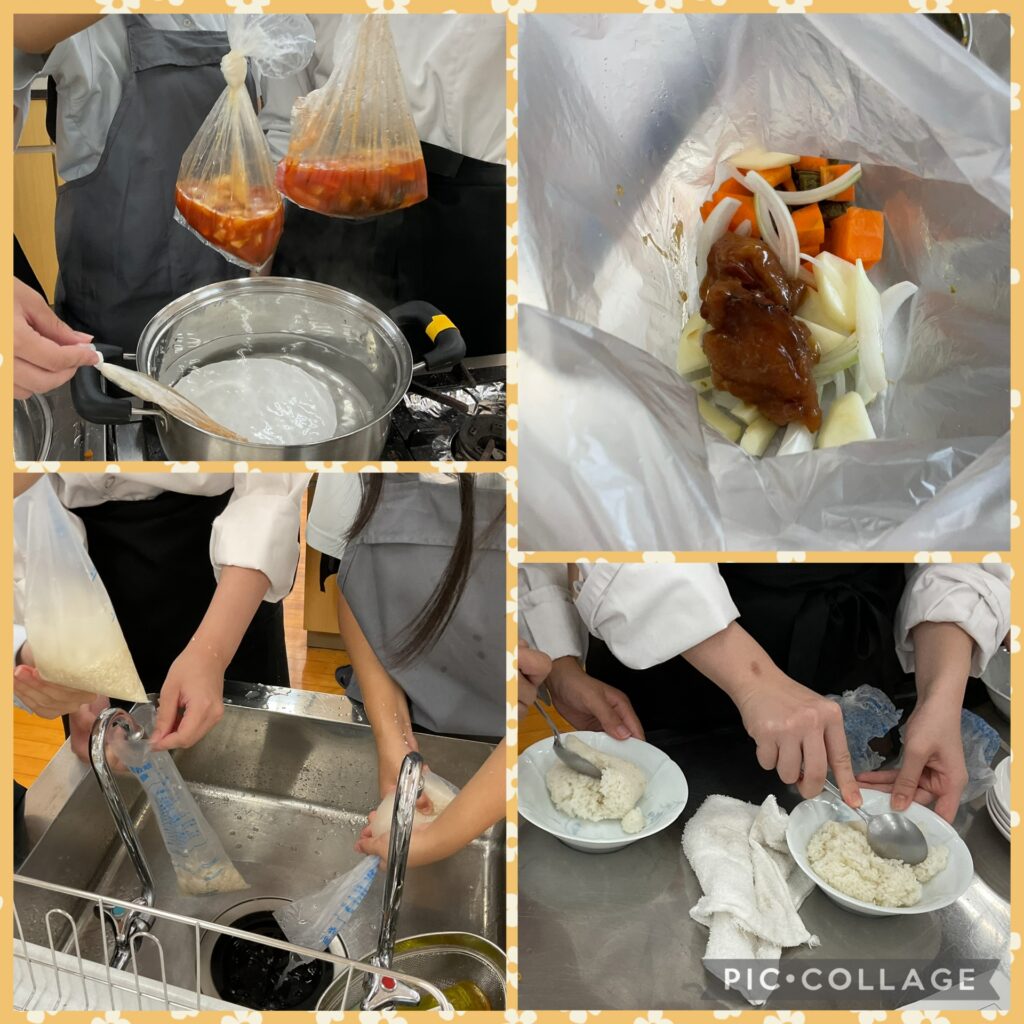 調理では、アイラップ(耐熱性ポリ袋)を使ってお米を炊く方法にチャレンジしました。