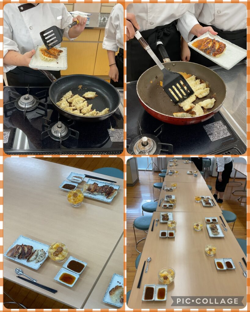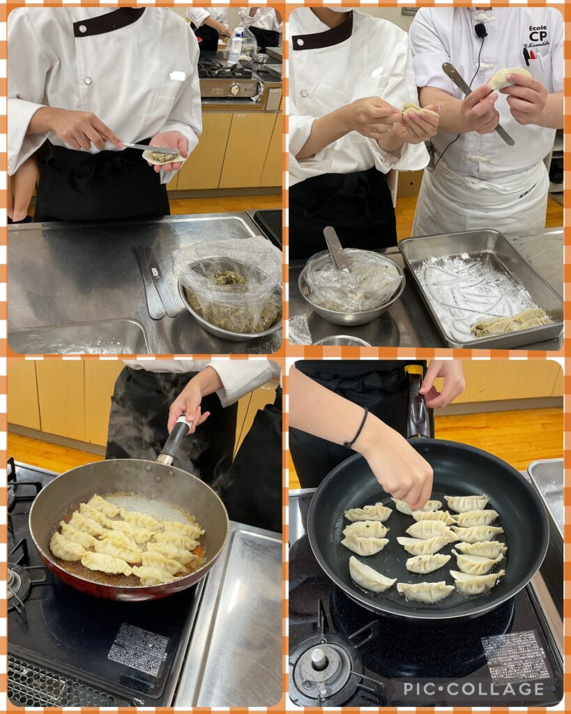 神戸国際調理製菓専門学校から川端先生と齋藤先生にお越しいただき、『焼き餃子』と『フルーツの金木犀ジュレがけ』の作り方を教えていただきました!