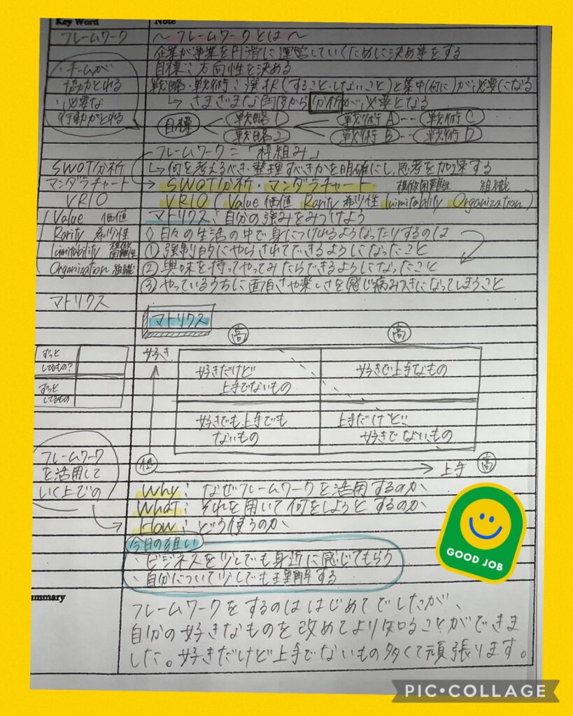 その後、「SWOT分析」「マンダラチャート」「VRIO分析」「マトリクス」という種類のフレームワークがあることを教えていただき、実際に、マトリクスをやってみました。「好きだけど上手ではないもの」「好きで上手なもの」「好きでも上手でもないもの」「上手だけど好きでないもの」を考え、文言の傾向や分布から自己分析を行いました。実際に書き込むことで可視化でき、自分の強みを見つけることが出来ました💪🔥