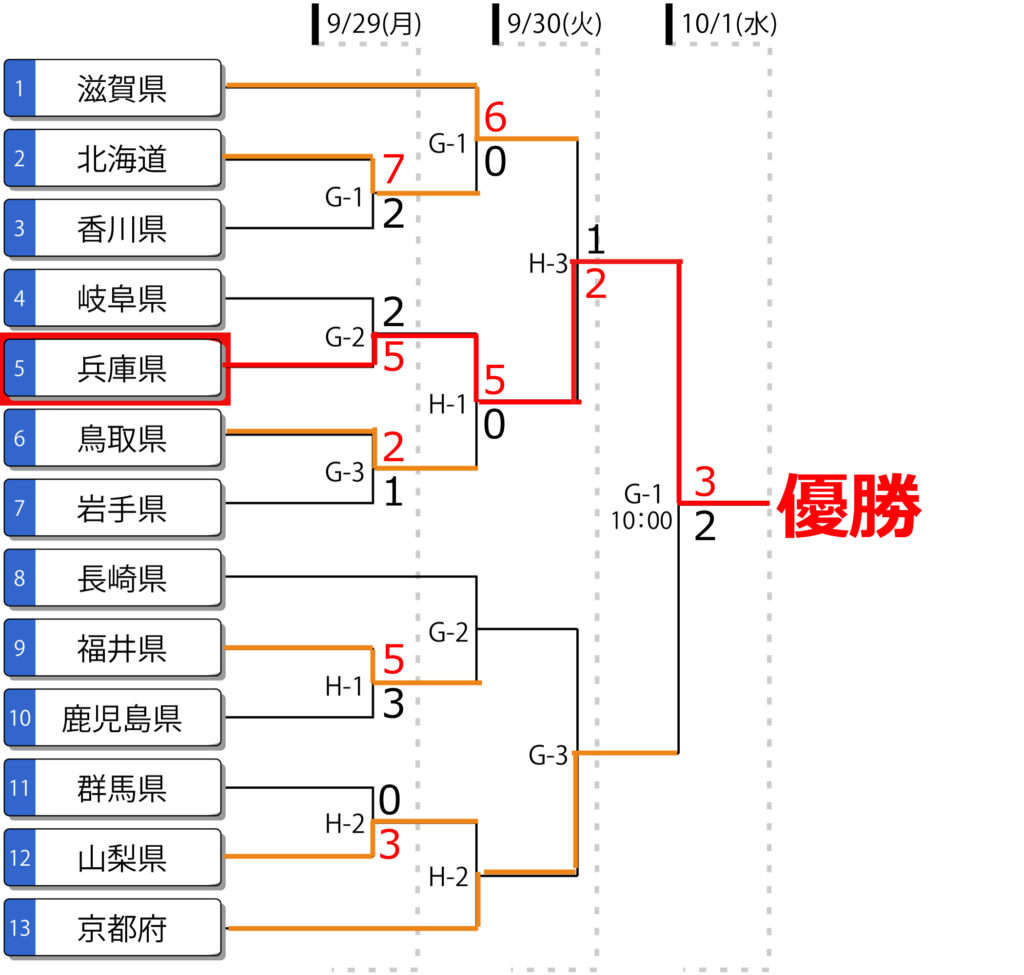 ・10月1日 10:00~ 決勝 京都府と対戦 3-2 タイブレークで勝利
