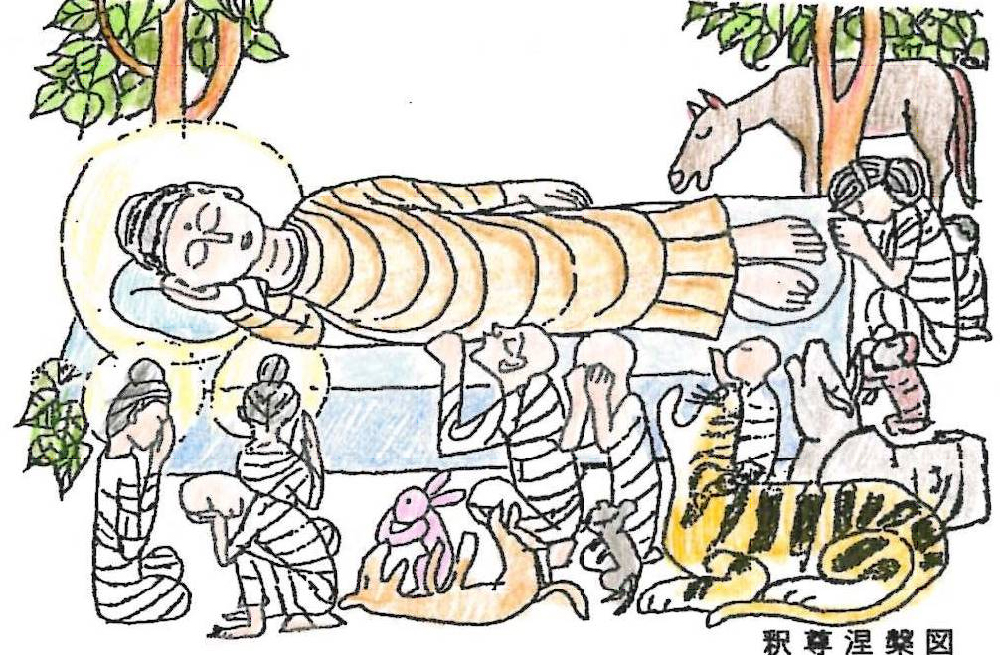 涅槃とは仏さまのお悟りのことで、釈尊が80歳でお亡くなりになりになった2月15日、また和国の教主と敬われた聖徳太子のご命日である2月22日を機縁に仏さまのみ法をこの世に初めて広めてくださった釈尊と、日本に仏教精神を柱とする国作りが大切であるとお示しくださった聖徳太子のお徳を偲び、その御恩に感謝し、仏教徒としての自覚を新たにする法会です。