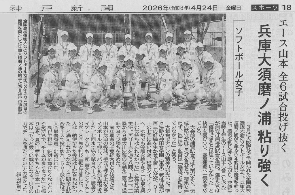 3月に大阪府などで開かれた全国高校選抜大会のソフトボール女子で、兵庫大須磨ノ浦が3年ぶり4度目の優勝を飾った。接戦を粘り強く勝ち上がり、決勝は当時1年生のエース山本心音(しおん)が無安打無得点試合を達成。選手たちは「優勝できるとは思っていなかった」と快挙を喜びつつ、春夏連覇へ士気を高めている。