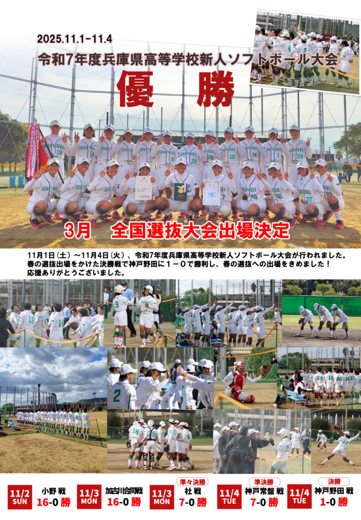 11月1日(土)~11月4日(火)、令和7年度兵庫県高等学校新人ソフトボール大会が行われます。春の選抜出場をかけ決勝戦で神戸野田に1-0で勝利し、春の選抜への出場をきめました!応援ありがとうございました。